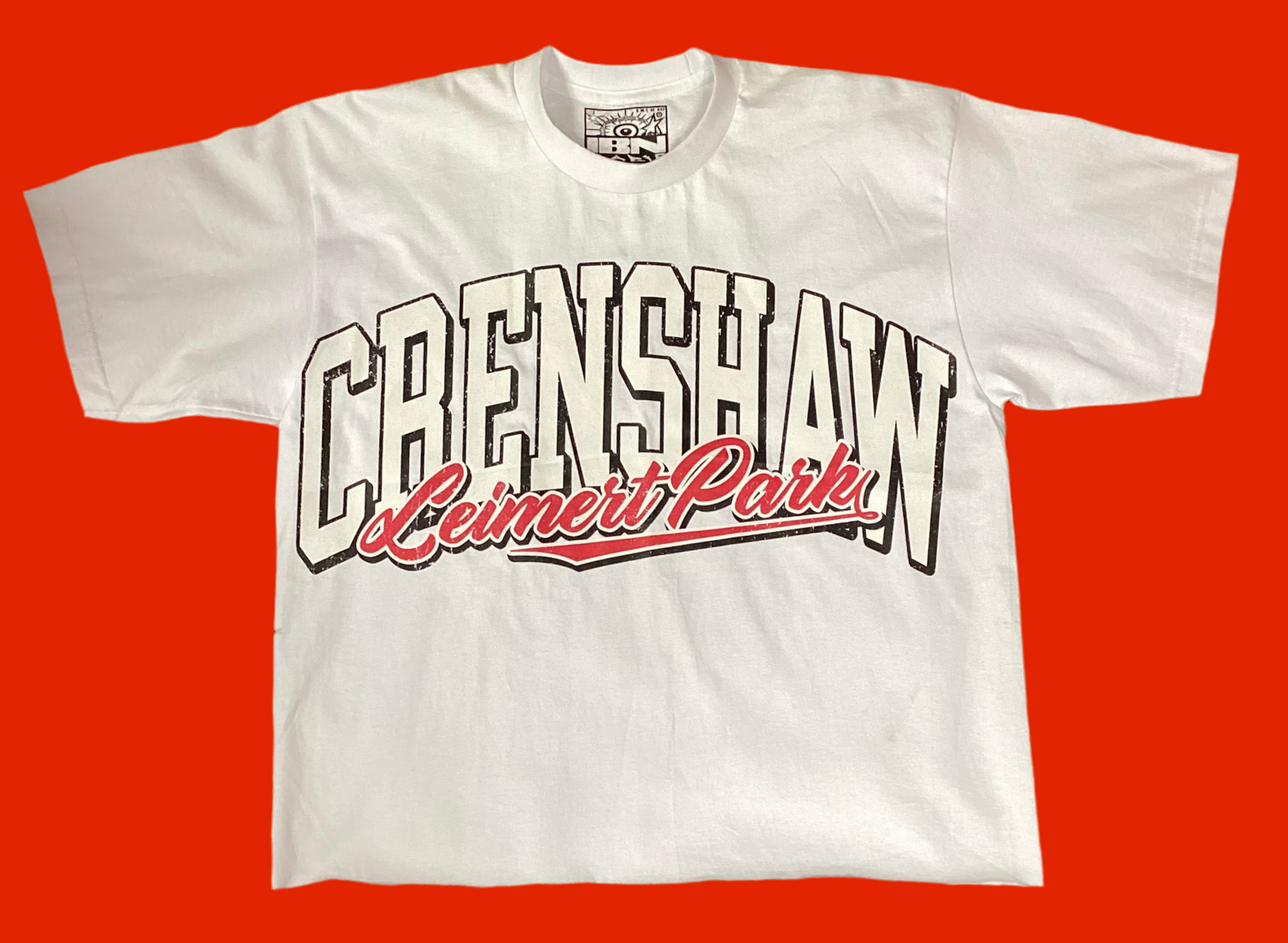 white shirts w/ bold font writing and crowd picture w/ low riders