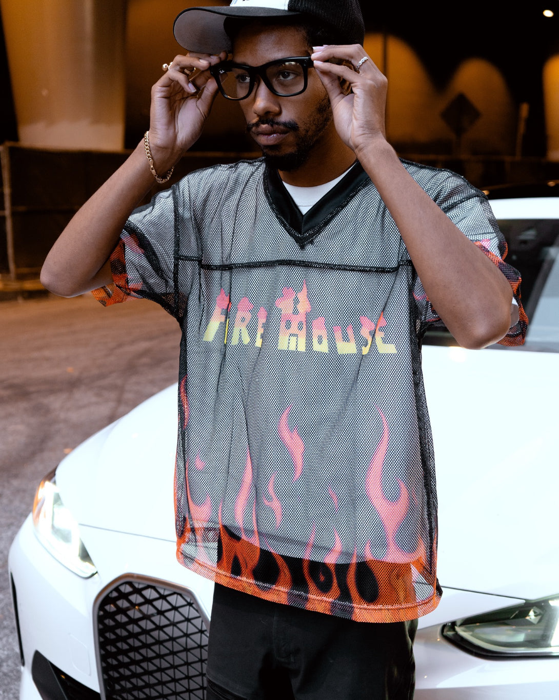 "FIRE HOUSE" TEXT IN RED AND YELLOW OMBRE ON FRONT
